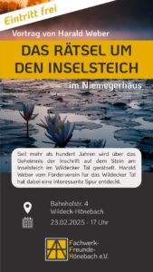 „Fünf Worte und ein Rätsel: „Quam rapuit invida mors restituta“ – seit über hundert Jahren rätselt man rings ums Wildecker Tal, was diese Inschrift auf dem Stein am Inselsteich zu bedeuten hat. Harald Weber vom Förderverein für das Wildecker Tal hat dazu eine Spur. Ein Philosoph und ein Dichter spielen eine Rolle darin.“